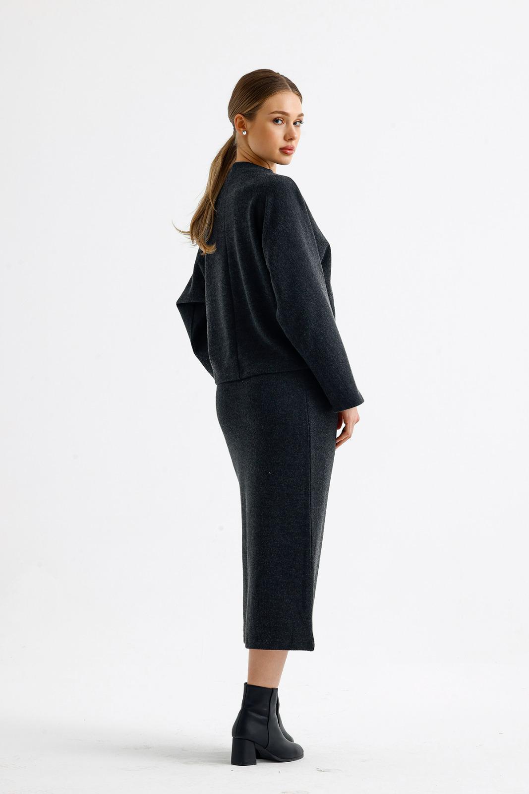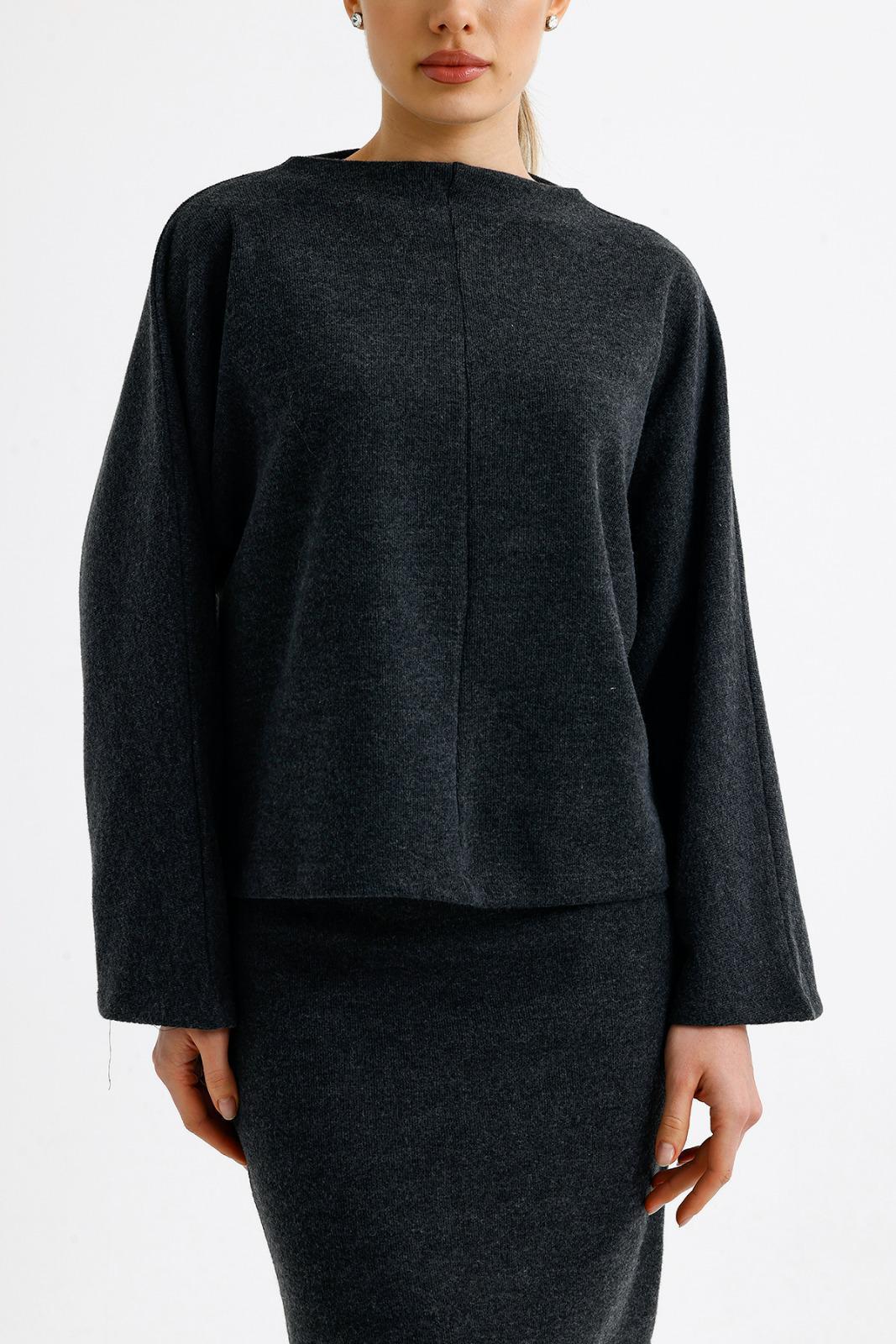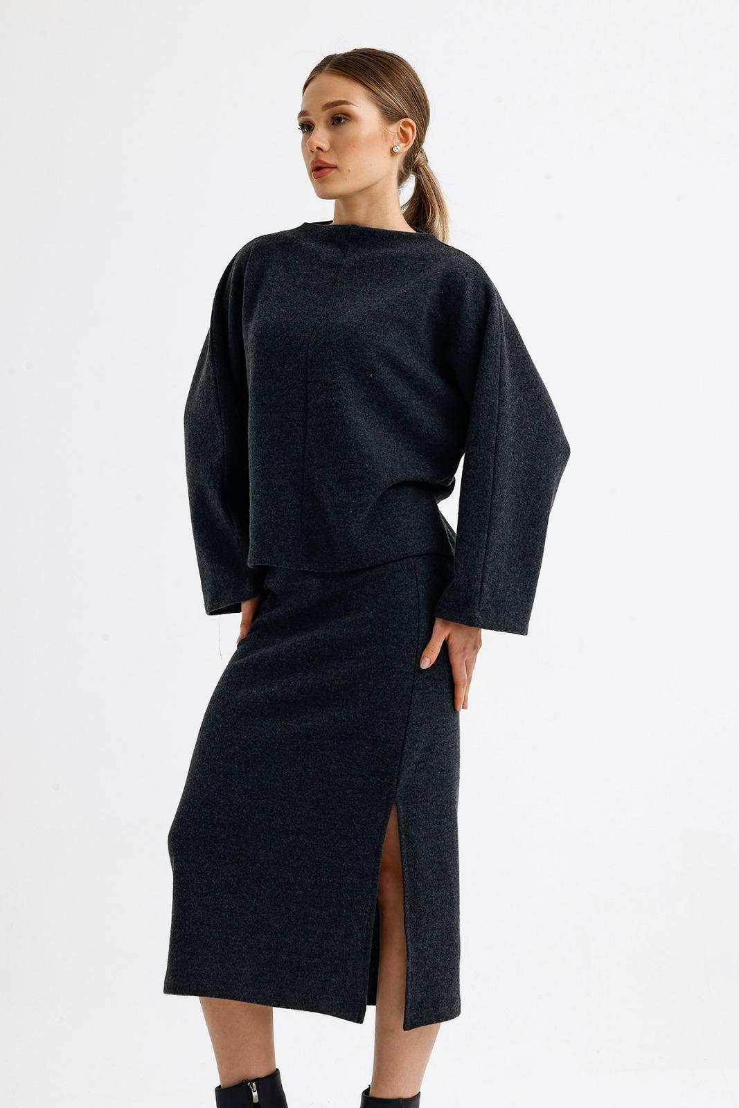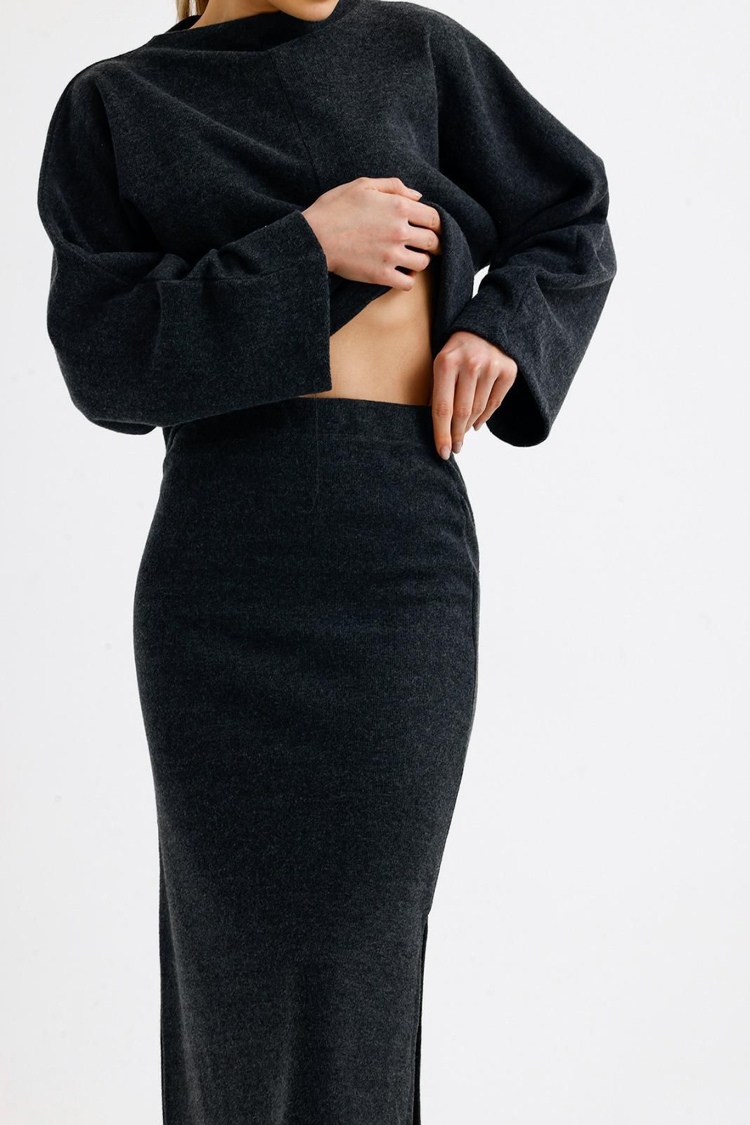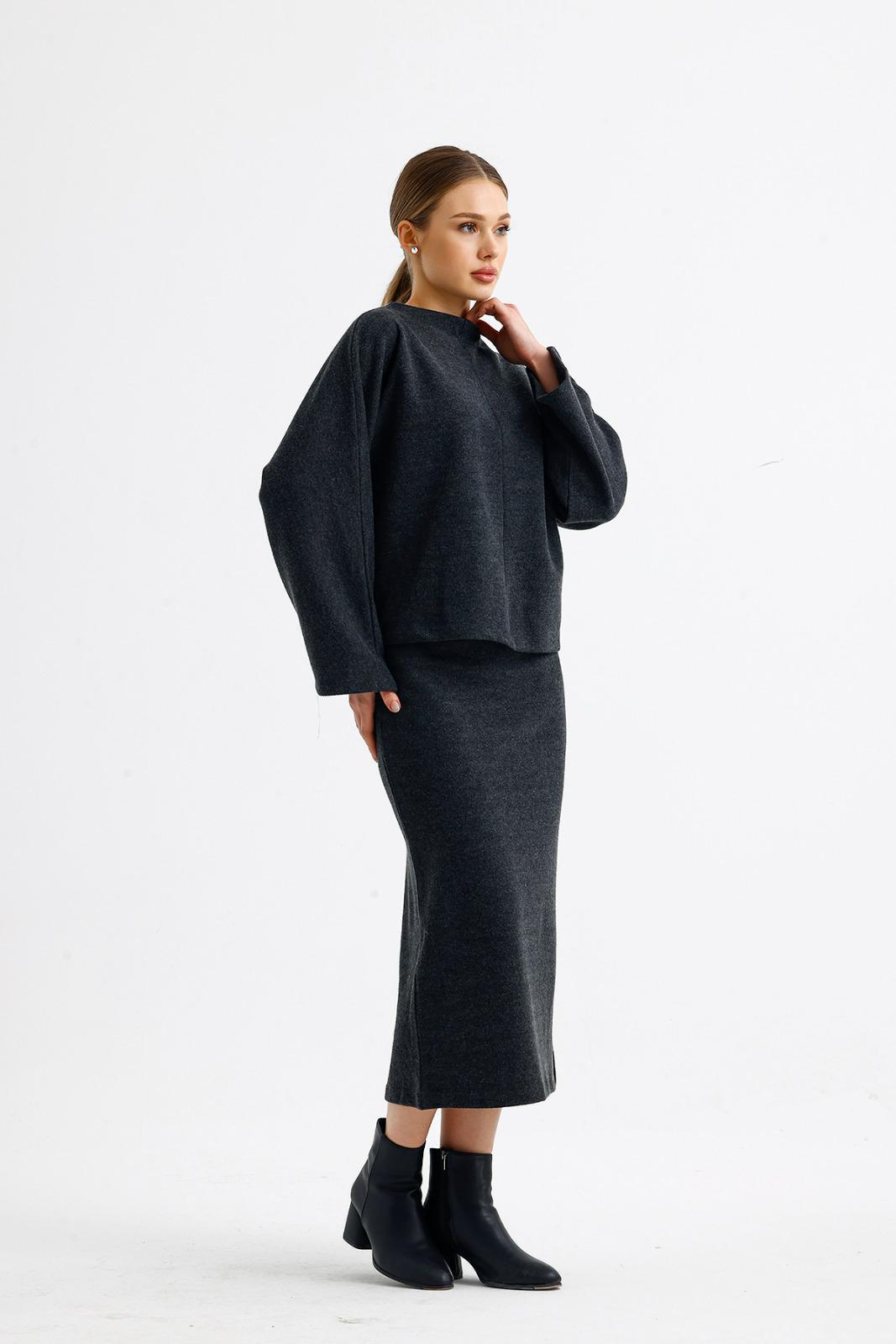 Oversize üst bedeni ve lastikli yüksek bel eteğiyle günün her saatinde rahatlık sağlayacak takımımız